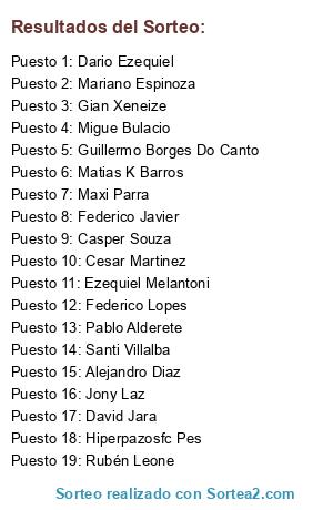 Lista de participantes: Maxi Parra, Santi Villalba, Rubén Leone, Gian Xeneize, Casper Souza, Pablo Alderete, Mariano Espinoza, Matias K Barros, David Jara, Migue Bulacio, Federico Lopes, Jony Laz, Cesar Martinez, Ezequiel Melantoni, Guillermo Borges Do Canto, Hiperpazosfc Pes, Dario Ezequiel, Federico Javier, Alejandro Diaz.