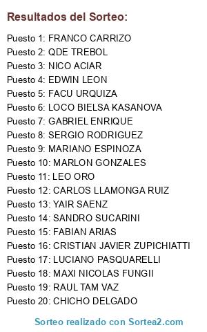 Lista de participantes: LEO ORO, LOCO BIELSA KASANOVA, MAXI NICOLAS FUNGII, MARIANO ESPINOZA, QDE TREBOL, EDWIN LEON, RAUL TAM VAZ, CRISTIAN JAVIER ZUPICHIATTI, SERGIO RODRIGUEZ, LUCIANO PASQUARELLI, GABRIEL ENRIQUE, YAIR SAENZ, NICO ACIAR, CHICHO DELGADO, FABIAN ARIAS, CARLOS LLAMONGA RUIZ, FRANCO CARRIZO, SANDRO SUCARINI, MARLON GONZALES, FACU URQUIZA.