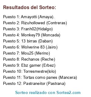 Lista de participantes: Ebz gamer (Erbez), 13 birras (Daban), Wolverine 83 (Jairo), Tortas como panes (Mancera), Rizuhollowed (Contreras), Amayotti (Amaya)., Monkey79 (Moncada), Torresmestre(lolo), Franh02(Hidalgo), Pastraneitor (Pastrana), Mou25 (Merino), Rechanos (Reche).