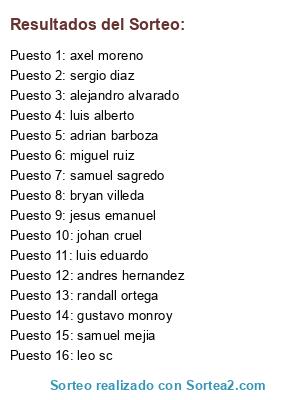 Lista de participantes: adrian barboza, alejandro alvarado, gustavo monroy, bryan villeda, jesus emanuel, samuel mejia, sergio diaz, miguel ruiz, luis eduardo, samuel sagredo, axel moreno, luis alberto, andres hernandez, leo sc, johan cruel, randall ortega.