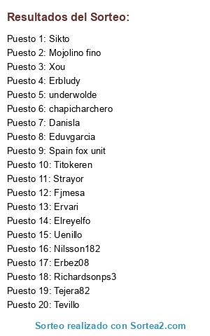 Lista de participantes: Erbez08, Tevillo, Fjmesa, Elreyelfo, Xou, Tejera82, Richardsonps3, underwolde, Sikto, Nilsson182, Eduvgarcia, Uenillo, Titokeren, Danisla, Mojolino fino, Spain fox unit, Strayor, Erbludy, Ervari, chapicharchero.