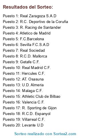 Lista de participantes: AT. Osasuna, Athletic Club de Bilbao, Atletico de Madrid, F.C.Barcelona, Getafe C.F., Hercules C.F., Levante U.D, Malaga C.F., R. Sporting de Gijon, Real Zaragoza S.A.D, R.C. Deportivo de la Coruña, R.C.D. Espanyol, R.C.D. Mallorca, Real Madrid C.F., Real Sociedad, R. Racing de Santander, Sevilla F.C.S.A.D, U.D. Almeria, Valencia C.F., Villarreal C.F..