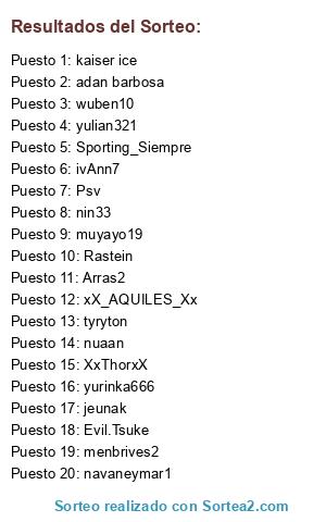 Lista de participantes: nin33, kaiser ice, XxThorxX, nuaan, Rastein, Psv, navaneymar1, adan barbosa, tyryton, jeunak, xX_AQUILES_Xx, Evil.Tsuke, Arras2, yulian321, Sporting_Siempre, muyayo19, ivAnn7, menbrives2, wuben10, yurinka666.