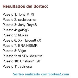 Lista de participantes: filukas, Virjor, BRAINISMR, Tony M 79, raulelcorner, g4f5g6, Xx Halcon8 xX, xLSDx Moskitin, Jony ReyeS, yulriosa, CristianPT20.