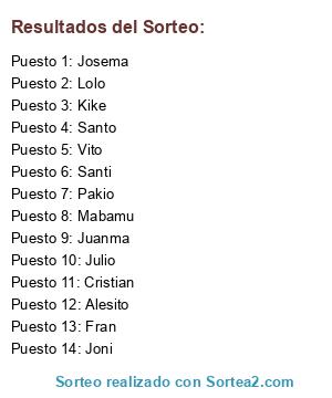 Lista de participantes: Fran, Santo, Santi, Cristian, Juanma, Mabamu, Joni, Julio, Pakio, Vito, Kike, Alesito, Lolo, Josema.
