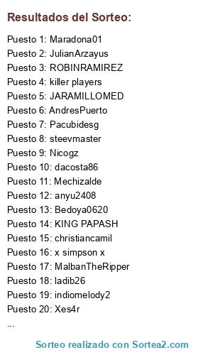 Lista de participantes: xMaurox9, ll PINTO ll 23, SECN, Giova Colombia, Sebaxcolo, Josekstrillon, IBc Diablo coI, KCG Karma, ANDFEPE GUNNER, rotsen01, Petrus64, ELiTe GoldenGun, Madachi, XxBuffoon13xX, rive435, Tonito1631, Fajardo360, camiloquipi.