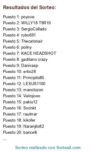 Lista de participantes: baricelli, kikofer, Naranjito82, colon666, Erchuliyo 24, Principito85, SergioCollado, raulmar, Calvente Civic, lobitooooo, poliny, SeRgyo2011, poyove, Sorinkt, menpu Xd, manolozon, Danivasp, DAVILON69, Pepitogrillo96, LEXUS1100, pakiu12, Valrojooo, WILLY18 T9R10, PABLO1975CORDOB, KACE HEADSHOT, totxarock, rubo691, Thecatonair, TenzoRSpaiN, ertio28, gaditano crazy, FANDI 87.