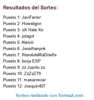 Lista de participantes: Joaquin407, Aleiviii, ZzZzZ79, masacrecar, oX Hate Xo, JaviFerrer, Howsitgon, borja ESP, Jonathanpnk, ResoluteMaDneSs, jotagol , zz Juanlu zz.