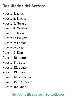 Lista de participantes: Isaac, Ferrari, iptuci, Vidalsergi, chipi, Polyny, Joan, Lolito, Dani, Jose, Nacho, Cheru, Sergio, Soto, elmanue, 34574799.