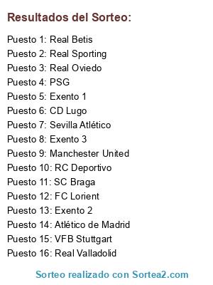 Lista de participantes: Real Oviedo, Exento 1, Atlético de Madrid, Exento 2, Sevilla Atlético, CD Lugo, RC Deportivo, FC Lorient, PSG, SC Braga, VFB Stuttgart, Real Valladolid, Manchester United, Real Betis, Real Sporting, Exento 3.