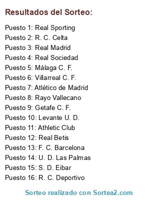 Lista de participantes: Málaga C. F., Levante U. D., Atlético de Madrid, F. C. Barcelona, Rayo Vallecano, Getafe C. F., Athletic Club, Real Betis, Villarreal C. F., Real Madrid, R. C. Deportivo, Real Sociedad, Real Sporting, R. C. Celta, S. D. Eibar, U. D. Las Palmas.