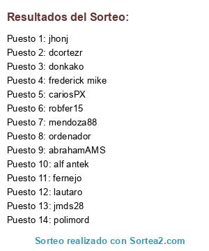 Lista de participantes: lautaro, fernejo, dcortezr, jhonj, donkako, mendoza88, frederick mike, jmds28, cariosPX, alf antek, abrahamAMS, robfer15, polimord, ordenador.