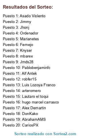 Lista de participantes: Marianetes, AbrahamAMS, Jhonj, Luis Lozoya Franco, Jimmy15, Alf Antek, CariosPX, DonKako, Jmds28, Asado Violento, hugo marcel carrasco, arteromero, robfer15, mbarex (topo), Alex Demartin, Pablobenjaminfc, Fernejo, Lautaro el toqui, Knyser, Ordenador.