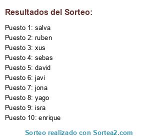 Lista de participantes: david, sebas, yago, ruben, jona, javi, isra, xus, enrique, salva.