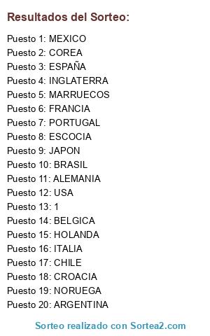 Lista de participantes: HOLANDA, ESPAÑA, ITALIA, INGLATERRA, BELGICA, ALEMANIA, PORTUGAL, CROACIA, NORUEGA, FRANCIA, ESCOCIA, COREA, BRASIL, MARRUECOS, ARGENTINA, MEXICO, CHILE, USA, JAPON, 1.