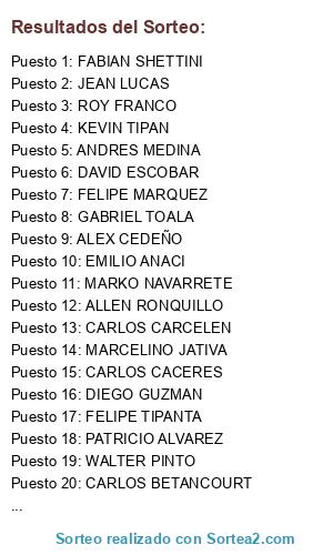 Lista de participantes: ADRIAN CRESPO, ALEX CEDEÑO, ALEX CORTAZAR, ALEXIS DIAZ, ALLEN RONQUILLO, ANDRES MEDINA, BOLIVAR BALDA, CARLOS ARANA, CARLOS BETANCOURT, CARLOS CACERES, CARLOS CARCELEN, DANIEL BERMUDEZ, DANNY CARDENAS, DARIO MORLA, DARIO SOTOMAYOR, DAVID ESCOBAR, DAVID SAA, DIEGO GUZMAN, DOMINICK ACUÑA, EMILIO ANACI, ERICK CALDERON, FABIAN SHETTINI, FELIPE MARQUEZ, FELIPE TIPANTA, FERNANDO CARRION, GABRIEL TOALA, ISRAEL ALVAREZ, JAIME DROUET, JEAN LUCAS, JEFFERSON OROZCO, JHON PORTILLA, JONATHAN MEDINA, JOSE GIACOMETTI, JOSUE GUILLEN, JUAN SANCHEZ, JUAN WONG, JUAN ZURITA, KEVIN TIPAN, LUIGI LUDEÑA, LUIS FIGUEROA, MARCELINO JATIVA, MARKO NAVARRETE, MARLON LOPEZ, MATEO ESPINEL, NICOLAS VELEZ, PATRICIO ALVAREZ, RICARDO ARROBO, RICKY CARVACHE, RIKY PURUNCAJAS, ROY FRANCO, SANTIAGO CAMACHO, SEBASTIAN ÑAUTA, SEBASTIAN VILLENA, VLADI ESCOBAR, WALTER PINTO, WILLIAM ZAMBRANO.