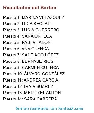 Lista de participantes: BERNABÉ RÍOS, MERITXEL ANTÓN, ANA CUENCA, CARMEN CUENCA, PAULA FABÓN, SARA CABRERA, SANTIAGO LÓPEZ, IRAIA SUÁREZ, LUCÍA GUERRERO, ANDREA GARCÍA, SARA ORTEGA, MARINA VELÁZQUEZ, ÁLVARO GONZÁLEZ, LIDIA SEGLAR.