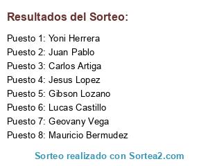 Lista de participantes: Juan Pablo, Jesus Lopez, Mauricio Bermudez, Carlos Artiga, Geovany Vega, Yoni Herrera, Gibson Lozano, Lucas Castillo.