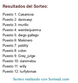 Lista de participantes: Casanova, Grey_jutge, Makinero, weirderjuanma, pablity, turfytomas, colon, willy, murillo, diego gallego, danimelou, danivasp.
