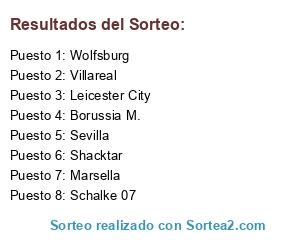 Lista de participantes: Schalke 07, Shacktar , Wolfsburg , Borussia M., Villareal , Sevilla , Marsella, Leicester City, .