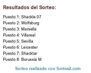 Lista de participantes: Shackle 07 , Wolfsburg , Shacktar , Borussia M, Villareal , Leicester, Marsella, Sevilla.