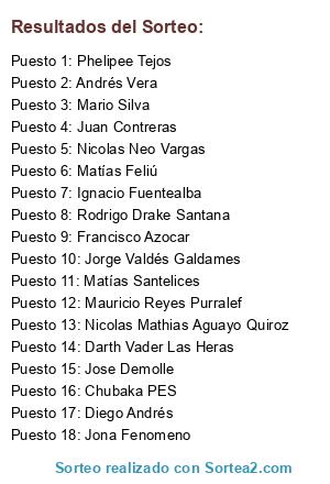 Lista de participantes: Nicolas Mathias Aguayo Quiroz, Mauricio Reyes Purralef, Diego Andrés, Mario Silva, Andrés Vera, Jona Fenomeno, Phelipee Tejos, Chubaka PES, Francisco Azocar, Rodrigo Drake Santana, Nicolas Neo Vargas, Jose Demolle, Darth Vader Las Heras, Juan Contreras, Ignacio Fuentealba, Jorge Valdés Galdames, Matías Feliú, Matías Santelices.