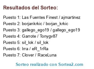 Lista de participantes: Las Fuentes Finest / ajmartinez, Clover / RaceLuna, Garrote / Tonygv87, gallego_ego19 / gallego_ego19, Irra / eR_1rRa, borjankrkic / borjan_krkic, sil_lok / sil_lok.