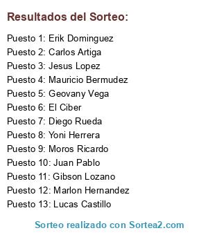 Lista de participantes: Jesus Lopez, Geovany Vega, Juan Pablo, Erik Dominguez, Lucas Castillo, Marlon Hernandez, Yoni Herrera, Carlos Artiga, Gibson Lozano, Mauricio Bermudez, Moros Ricardo, Diego Rueda, El Ciber.