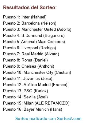 Lista de participantes: Arsenal (Maxi Cisneros), Atlético Madrid (Franco), B.Dormund (Bulganero), Barcelona (Nelson), Bayer Munich (Hans), Chelsea (Anthoni), Inter (Nahuel), Juventus (Jose), Liverpool (Rodrigo), Manchester City (Cristian), Manchester United (Adolfo), Milan (ALE RETAMOZO), PSG (Karlox), Real Madrid (Alvaro), Roma (Daniel), Sevilla (Axel).