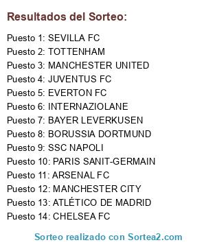 Lista de participantes: SEVILLA FC, ATLÉTICO DE MADRID, MANCHESTER CITY, MANCHESTER UNITED, BORUSSIA DORTMUND, BAYER LEVERKUSEN, ARSENAL FC, CHELSEA FC, EVERTON FC, TOTTENHAM, PARIS SANIT-GERMAIN, JUVENTUS FC, INTERNAZIOLANE, SSC NAPOLI.