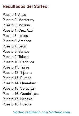 Lista de participantes: America, Atlas, Cruz Azul, Guadalajara, Leon, Morelia, Monterrey, Necaxa, Pachuca, Puebla, Pumas, Queretaro, Santos, Lobos, Toluca, Tigres, Tijuana, Veracruz.