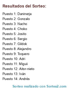 Lista de participantes: Aitor-nieto, Josito, Toquero, Gonzalo, Iván, Miguii, Nacho, Sergio, Alejandro, Gildok, Choko, Daninerja, Andrés, Adri.