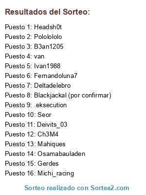 Lista de participantes: Headsh0t, .eksecution, Osamabauladen, Gerdes, Ivan1988, B3an1205, Fernandoluna7, Blackjackal (por confirmar), Deltadelebro, Pololololo, van, Michi_racing, Seor, Mahiques, Ch3M4, Deivits_03.