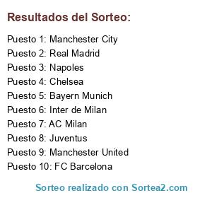 Lista de participantes: FC Barcelona, Real Madrid, Manchester United, Manchester City, AC Milan, Bayern Munich, Chelsea, Inter de Milan, Napoles, Juventus.