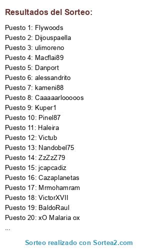 Lista de participantes: alessandrito, Caaaaarlooooos, Kuper1, jcapcadiz, Cazaplanetas, Macflai89, Flywoods, BaldoRaul, xO Malaria ox, ulimoreno, Mrmohamram, Nandobel75, Suprunaman, Dijouspaella, ZzZzZ79, VictorXVII, Victub, Pinel87, DarkanESP, Haleira, kameni88, Danport.