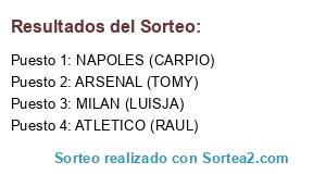 Lista de participantes: MILAN (LUISJA), ATLETICO (RAUL), NAPOLES (CARPIO), ARSENAL (TOMY).
