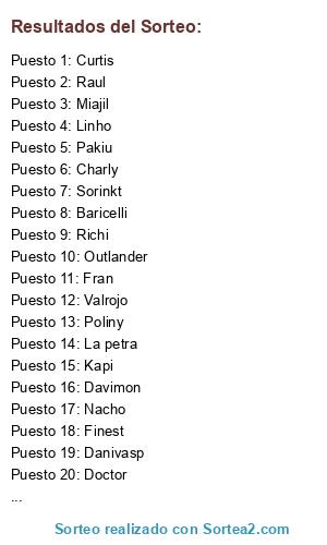 Lista de participantes: Naranjito, Fran, Outlander, Miajil, Doctor, Baricelli, Poliny, Lobo, Pakiu, Richi, Linho, Kapi, Nacho, Sorinkt, Valrojo, Davimon, Finest, Raul, Danivasp, Curtis, La petra, Charly.