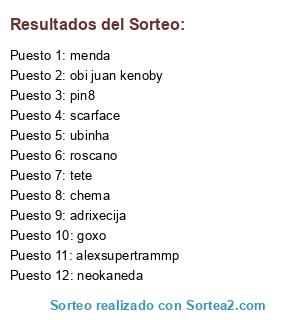 Lista de participantes: tete, adrixecija, obi juan kenoby, ubinha, menda, scarface, roscano, pin8, alexsupertrammp, goxo, neokaneda, chema.