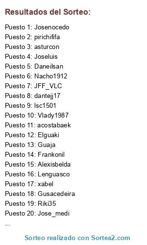 Lista de participantes: Tankvire, Lenguasco, asturcon, JFF_VLC, Elreyelfo, dantejj17, Gusacedeira, Nacho1912, Frankonil, Guaja, Riki35, xabel, Trakino, CesaryMarta, Davidb3, Kerulo, Lemako, Vlady1987, acostabaek, lsc1501, Daneilsan, Zennda, Alexisbelda, Elmaki19, DanielSaffour, Jose_medi, Elguaki, pirichififa, Potchoto, Drakokeeper, Joseluis, Josenocedo.