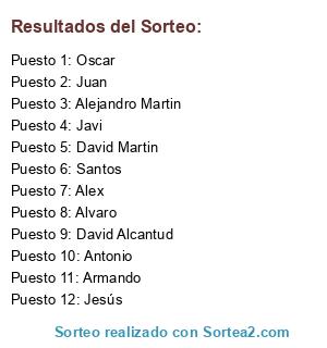 Lista de participantes: AroundTheWorld, guillerclk7, TheKeko, vodkabulario, TinoBarman, nono343, ToporVeteYa, Nelox, mitjigoes, Watios, Patche, Tato Daf, Christiansen, contolnecle, Patillas, eSnaKe3000.