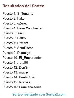 Lista de participantes: DonSr, leticoes, Frankenweenie, ShurPiston, Petko, Xerru, lara90, Sr.Tunante, DJamigo, matiii7, oZerec, PueRCoYo, Faker, Rivedra, El_Emperdedor, Dean Winchester.