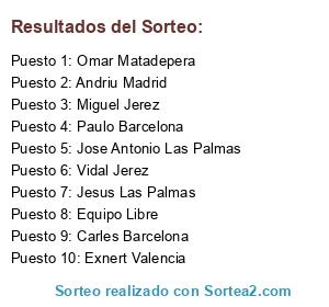 Lista de participantes: Jose Antonio Las Palmas, Miguel Jerez, Exnert Valencia, Omar Matadepera, Paulo Barcelona, Jesus Las Palmas, Andriu Madrid, Carles Barcelona, Vidal Jerez, Equipo Libre.