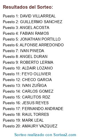 Lista de participantes: CARLOS GOMEZ, JESUS REYES, JONATHAN PORTILLO, ROBERTO LERMA, CARLITOS RDZ, DAVID VILLARREAL, MARK LEAL, ALDAIR LOZANO, AMAURY VAZQUEZ, FERNANDO ANDRADE, IVAN ZUÑIGA, ANGEL ACOSTA, CHECO GARCIA, RAUL TORRES, FABIAN RAMOS, ANGEL DURAN, IVAN PINEDA, ALFONSE ARREDONDO, FEYO OLLIVIER, GUILLERMO SANCHEZ.