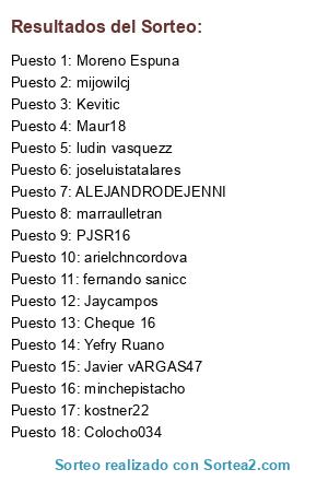 Lista de participantes: Jaycampos, marraulletran, mijowilcj, Cheque 16, fernando sanicc, Javier vARGAS47, Moreno Espuna, Yefry Ruano, Kevitic, arielchncordova, ALEJANDRODEJENNI, PJSR16, minchepistacho, kostner22, ludin vasquezz, joseluistatalares, Maur18, Colocho034.
