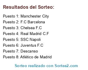Lista de participantes: Real Madrid C.F 1, Atlético de Madrid 1, F.C Barcelona 1, SSC Napoli 1, Juventus F.C 1, Chelsea F.C 1, Manchester City 1, Descanso 1, Real Madrid C.F 2, Atlético de Madrid 2, F.C Barcelona 2, SSC Napoli 2, Juventus F.C 2, Chelsea F.C 2, Manchester City 2, Descanso 2, Real Madrid C.F 3, Atlético de Madrid 3, F.C Barcelona 3, SSC Napoli 3, Juventus F.C 3, Chelsea F.C 3, Manchester City 3, Descanso 3, Real Madrid C.F 4, Atlético de Madrid 4, F.C Barcelona 4, SSC Napoli 4, Juventus F.C 4, Chelsea F.C 4, Manchester City 4, Descanso 4, Real Madrid C.F 5, Atlético de Madrid 5, F.C Barcelona 5, SSC Napoli 5, Juventus F.C 5, Chelsea F.C 5, Manchester City 5, Descanso 5, Real Madrid C.F 6, Atlético de Madrid 6, F.C Barcelona 6, SSC Napoli 6, Juventus F.C 6, Chelsea F.C 6, Manchester City 6, Descanso 6, Real Madrid C.F 7, Atlético de Madrid 7, F.C Barcelona 7, SSC Napoli 7, Juventus F.C 7, Chelsea F.C 7, Manchester City 7, Descanso 7.