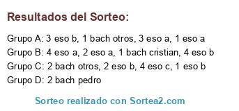 Lista de participantes: 1 eso a, 1 eso b, 2 eso a, 2 eso b, 3 eso a, 3 eso b, 4 eso a, 4 eso b, 4 eso c, 1 bach cristian, 1 bach otros, 2 bach pedro, 2 bach otros.