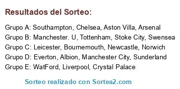 Lista de participantes: Manchester City, WatFord, Arsenal, Manchester. U, Leicester, Tottenham, Crystal Palace, Southampton, Liverpool, Albion, Everton, Swensea, Stoke City, Chelsea, Norwich, Bournemouth, Sunderland, Newcastle, Aston Villa.