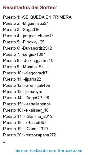 Lista de participantes: -Migueinsua94, -xBarza56U, - Gianc-1320, - Gonima_2019, - Wikinlee, -renzozapana272, - Jeikinggamer10, -diegocrack71, -Greninja5456, -Duvanortiz2912, -sergiox1007, -DiegoGP_98, -Pinoxky_25, -jorgeestebanc17, -iestrellaponce, -Saga316, -jjparra22, -elkaisser_10, -matias_alonso_8, -jomaoyre, -Manolo_Skillz, -SE QUEDA EN PRIMERA.