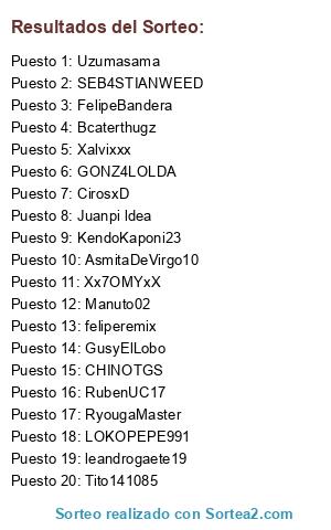 Lista de participantes: KendoKaponi23, Xx7OMYxX, SEB4STIANWEED, CirosxD, Xalvixxx, LOKOPEPE991, Tito141085, FelipeBandera, AsmitaDeVirgo10, RyougaMaster, Uzumasama, Bcaterthugz, feliperemix, leandrogaete19, GONZ4LOLDA, RubenUC17, GusyElLobo, Manuto02, CHINOTGS, Juanpi ldea.