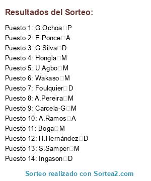 Lista de participantes: A.Pereira M, A.Ramos A, Boga M, Carcela-G M, E.Ponce A, Foulquier D, G.Ochoa P, G.Silva D, H.Hernández D, Hongla M, Ingason D, S.Samper M, U.Agbo M, Wakaso M.